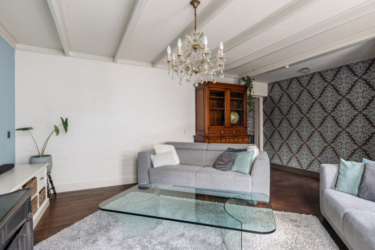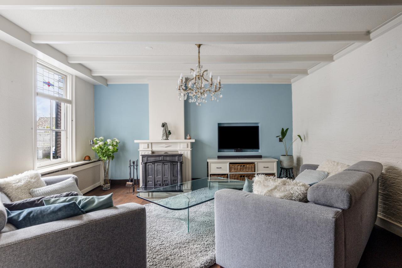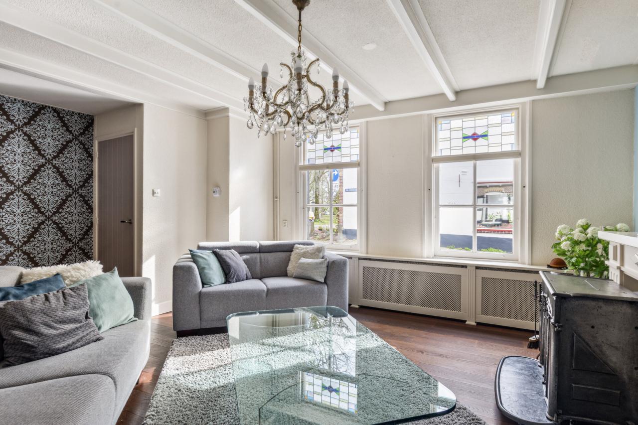 Via de karakteristieke voorgevel betreedt u de woning. Binnen valt direct de lichte en sfeervolle woonkamer op. Deze ruimte ademt karakter door de aanwezigheid van het balkenplafond en de authentieke kachel, gecombineerd met een prettige lichtinval dankzij de raampartijen.