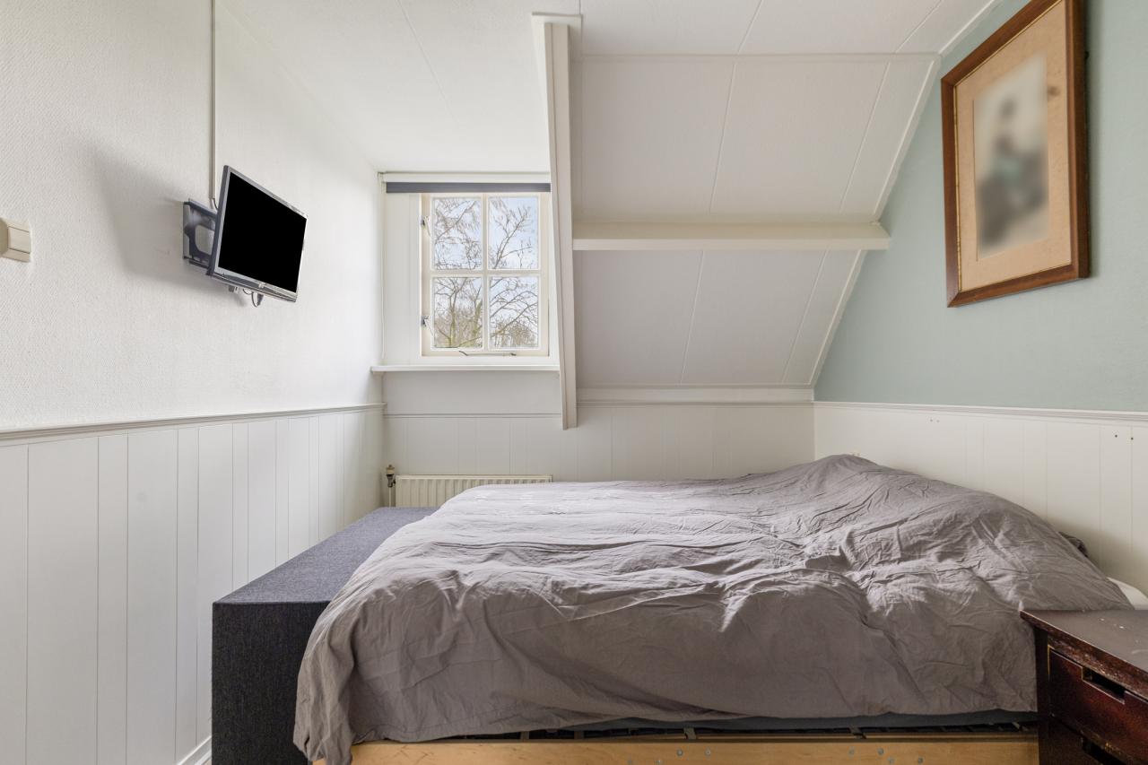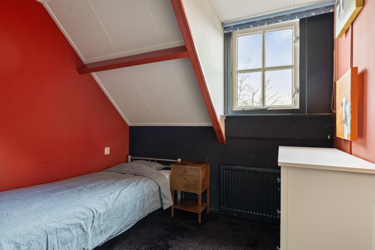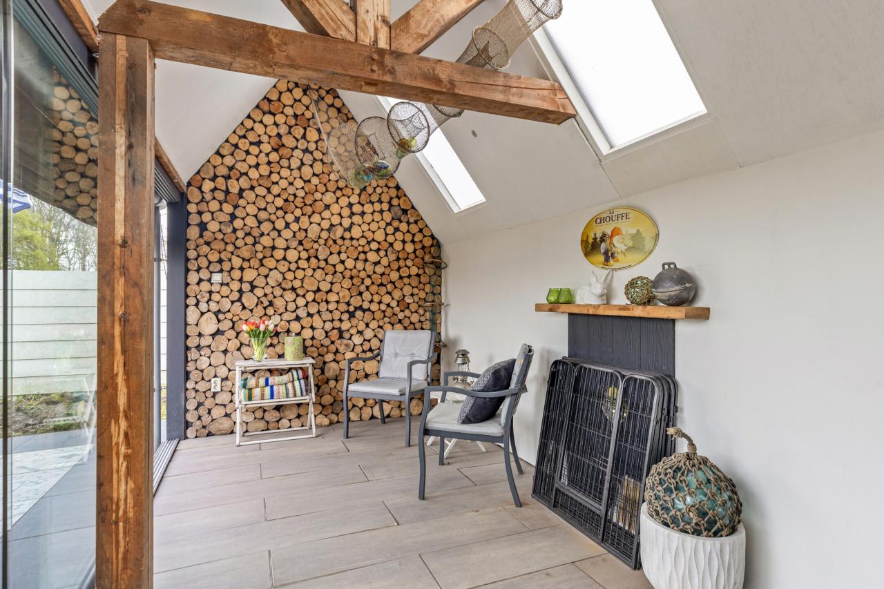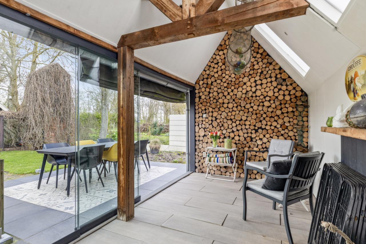 Via de karakteristieke voorgevel betreedt u de woning. Binnen valt direct de lichte en sfeervolle woonkamer op. Deze ruimte ademt karakter door de aanwezigheid van het balkenplafond en de authentieke kachel, gecombineerd met een prettige lichtinval dankzij de raampartijen.