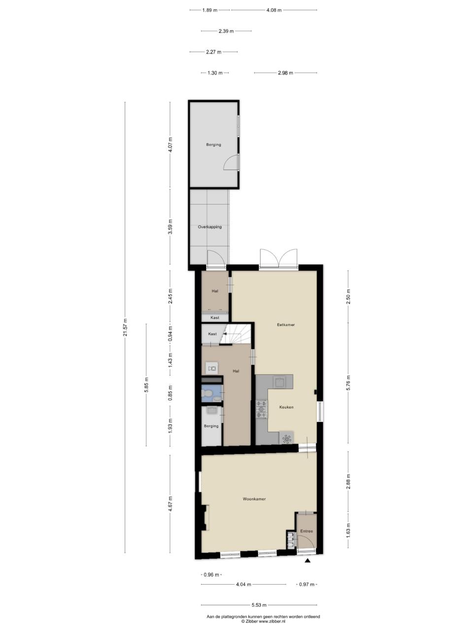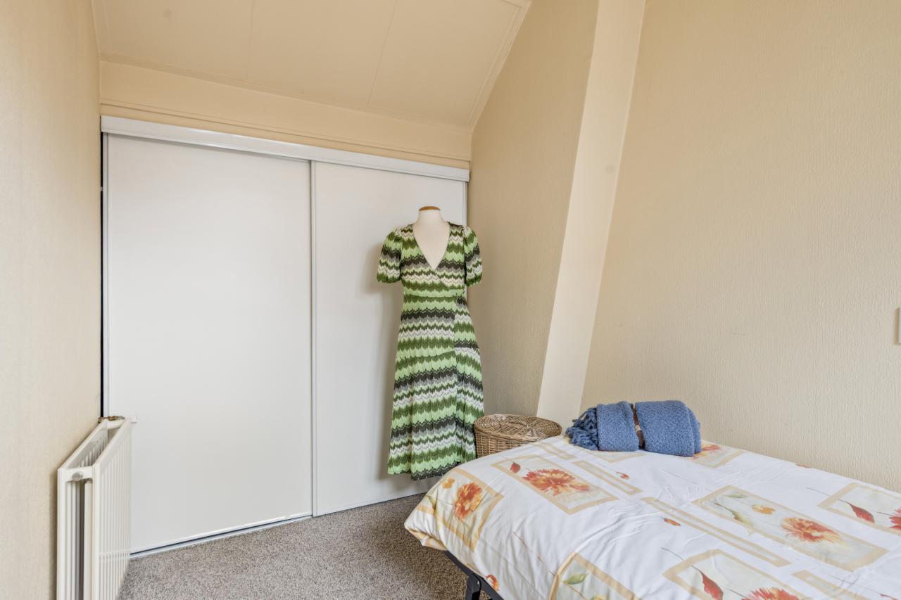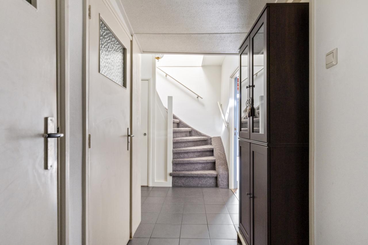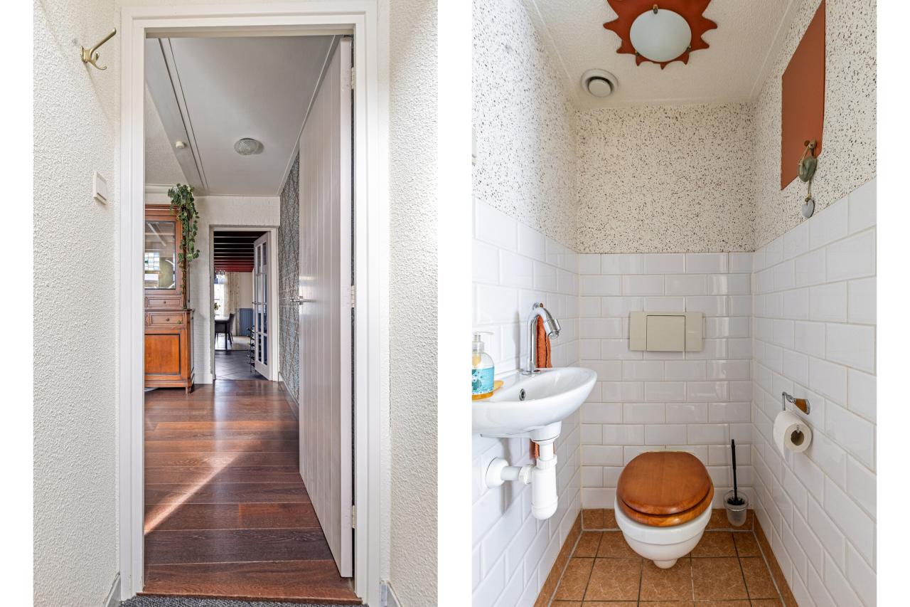 Aangrenzend bevinden zich de bijkeuken en het toilet. Vanuit de bijkeuken is tevens de trapopgang naar de verdieping bereikbaar.
