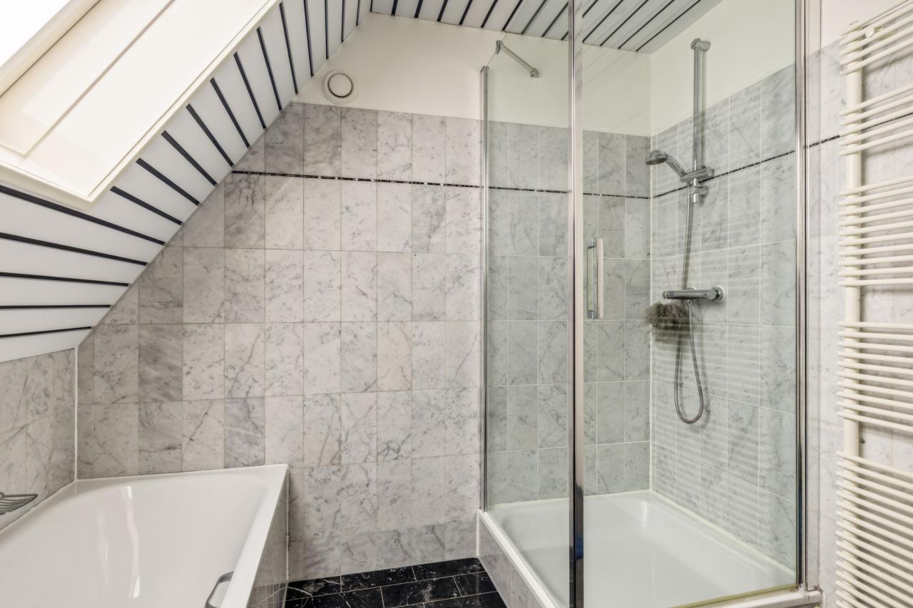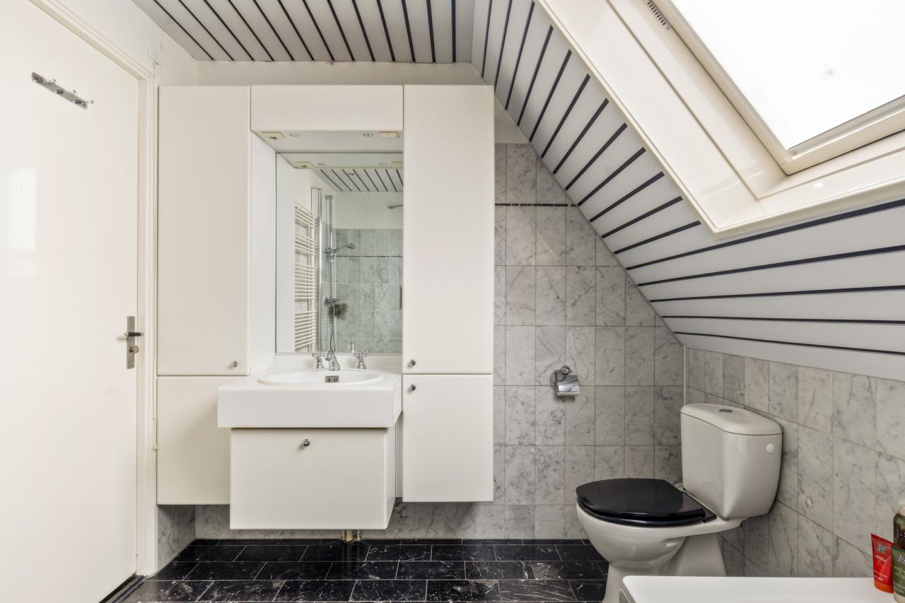 De badkamer is netjes uitgevoerd en voorzien van een douche, toilet en wastafel.