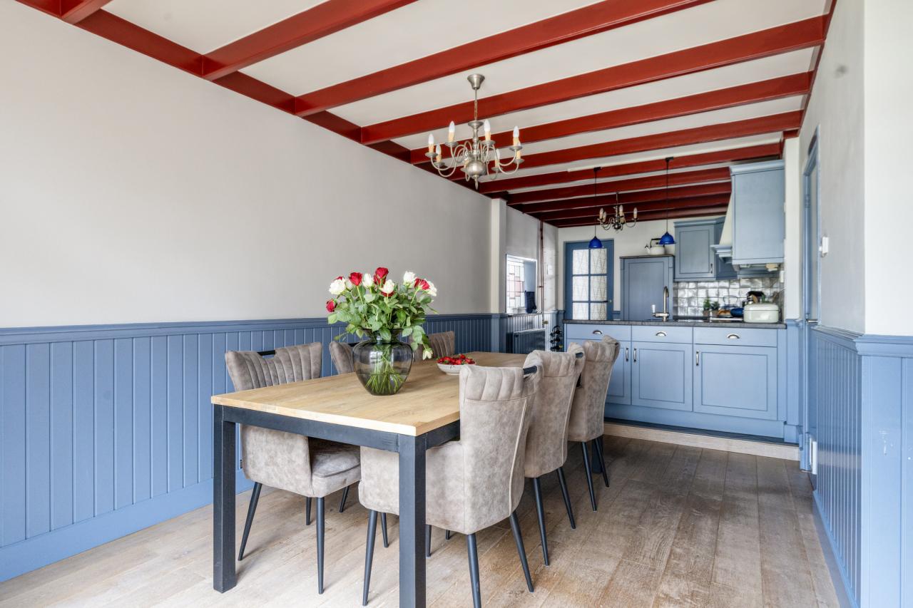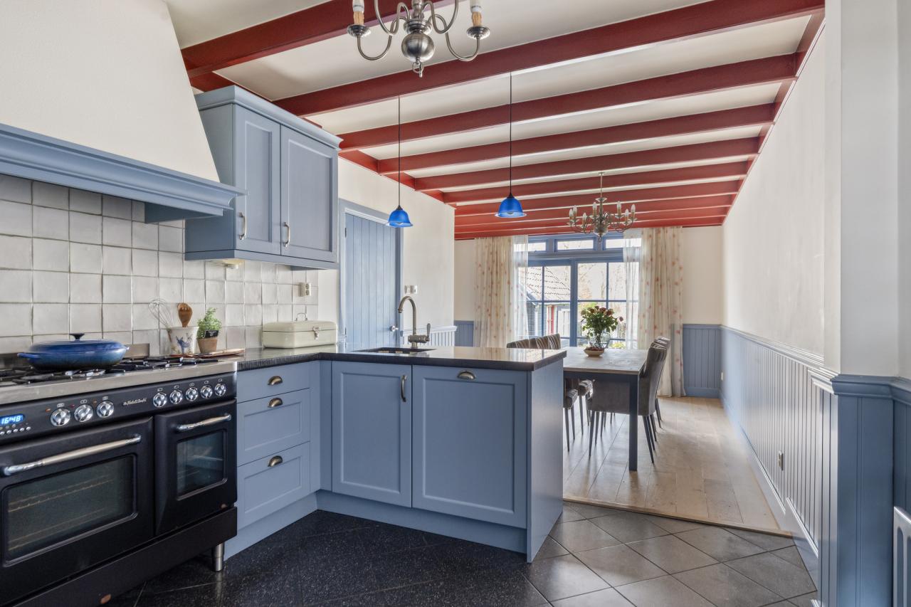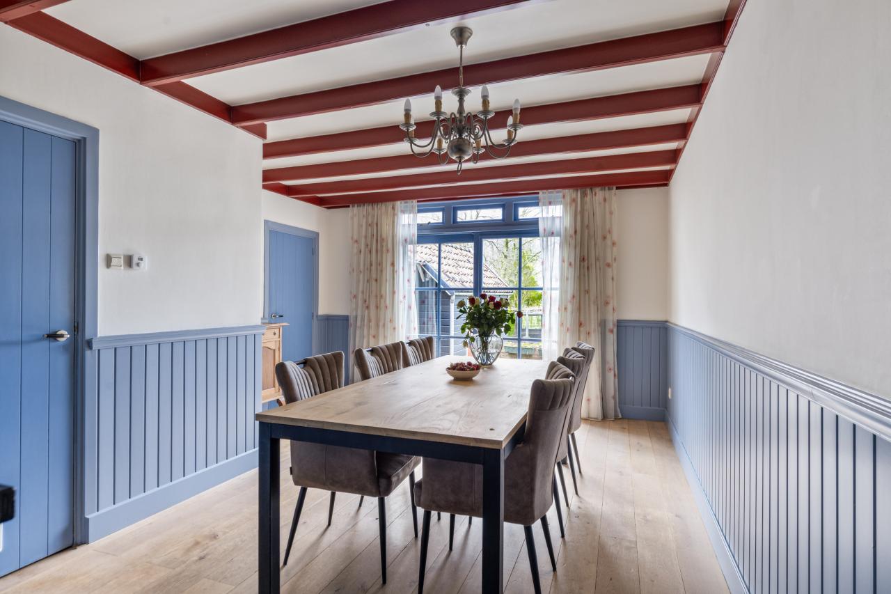De woonkamer staat in open verbinding met de eetkamer en keuken, waardoor een fijne leefruimte ontstaat. De keuken heeft een landelijke uitstraling met een moderne afwerking en is praktisch ingericht. Dankzij de grote raampartijen is er veel daglicht en heeft u direct contact met de tuin.