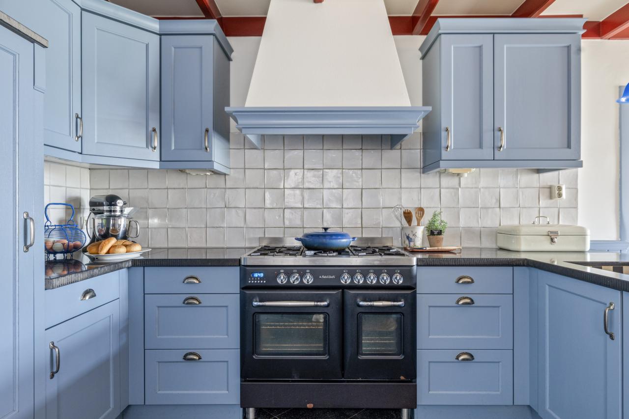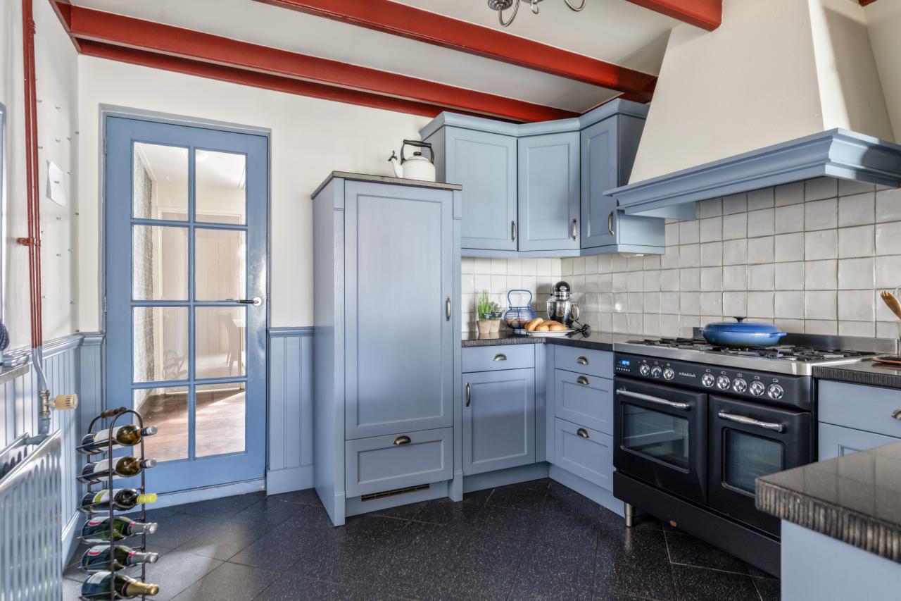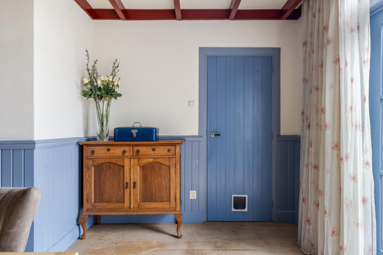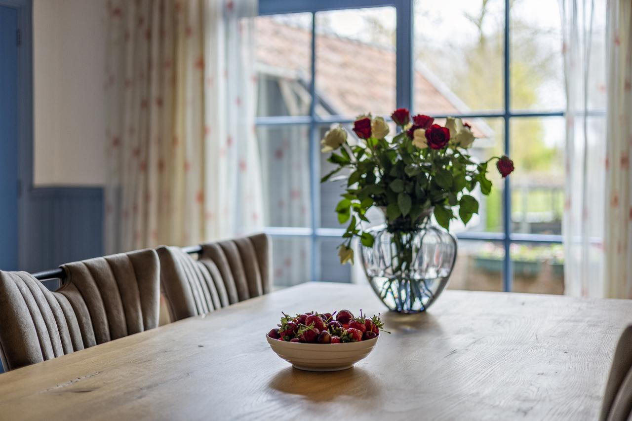 De woonkamer staat in open verbinding met de eetkamer en keuken, waardoor een fijne leefruimte ontstaat. De keuken heeft een landelijke uitstraling met een moderne afwerking en is praktisch ingericht. Dankzij de grote raampartijen is er veel daglicht en heeft u direct contact met de tuin.
