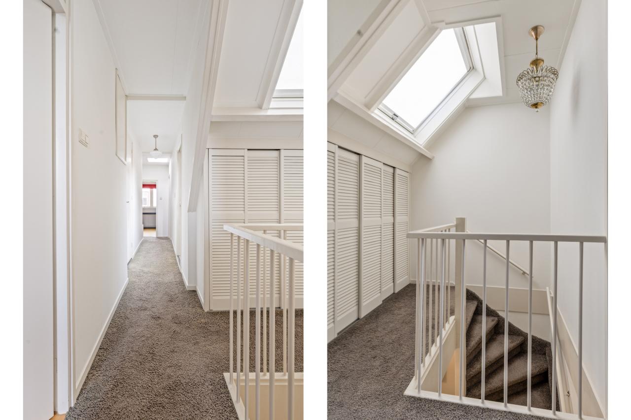 De overloop is opvallend licht en geeft toegang tot vier slaapkamers. Enkele slaapkamers zijn voorzien van vaste kasten. Op de overloop bevindt zich bovendien een nis die ideaal is als thuiswerkplek.