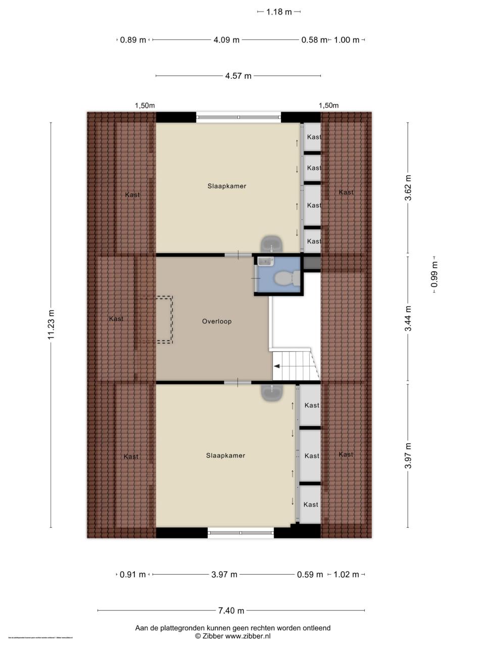 De overloop is zo ruim dat het mogelijk is hier een extra badkamer te realiseren. Er is al een toilet aanwezig. Er zijn twee grote slaapkamers van respectievelijk 4.57 × 3.62 m en 4.57 × 3.97 m (gemeten op de 1.50-meterlijn). Deze kamers zijn relatief eenvoudig te splitsen zodat er meer slaapkamers kunnen worden gecreëerd.