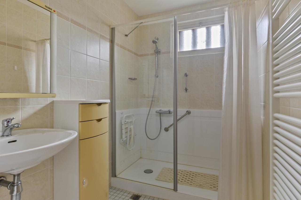 Naast de slaapkamer ligt de badkamer met douche en wastafel.