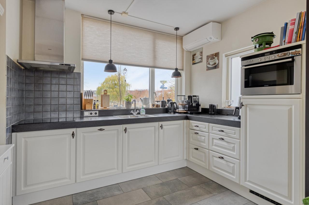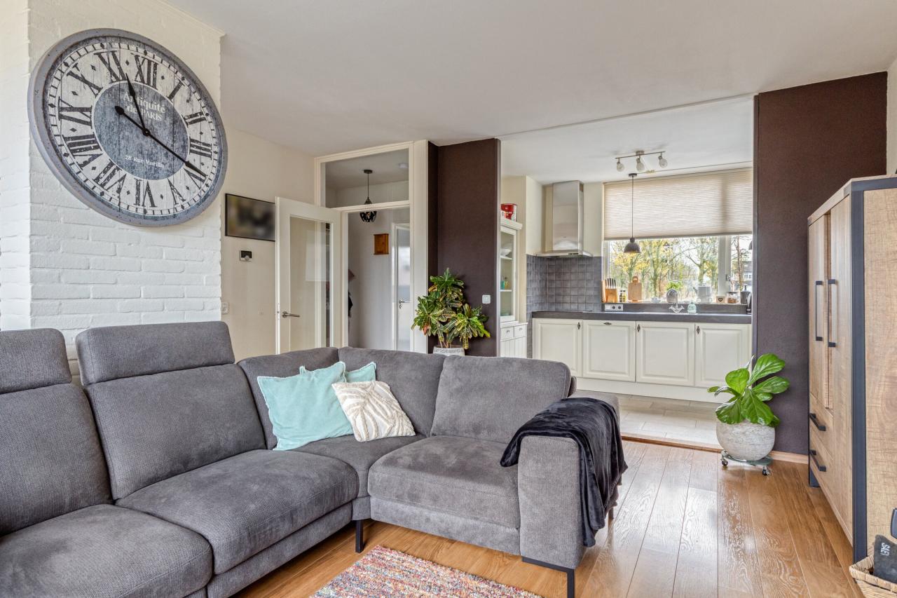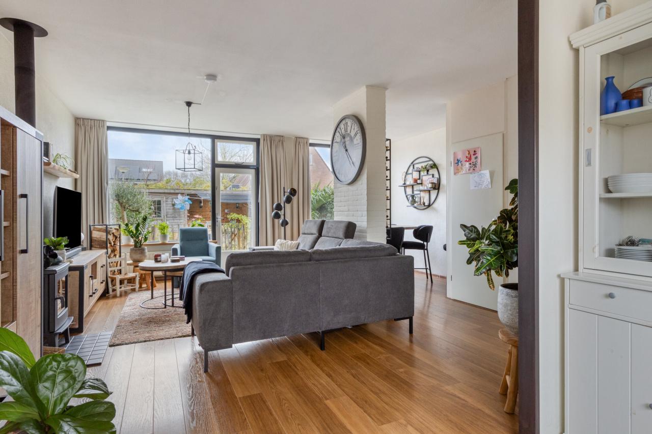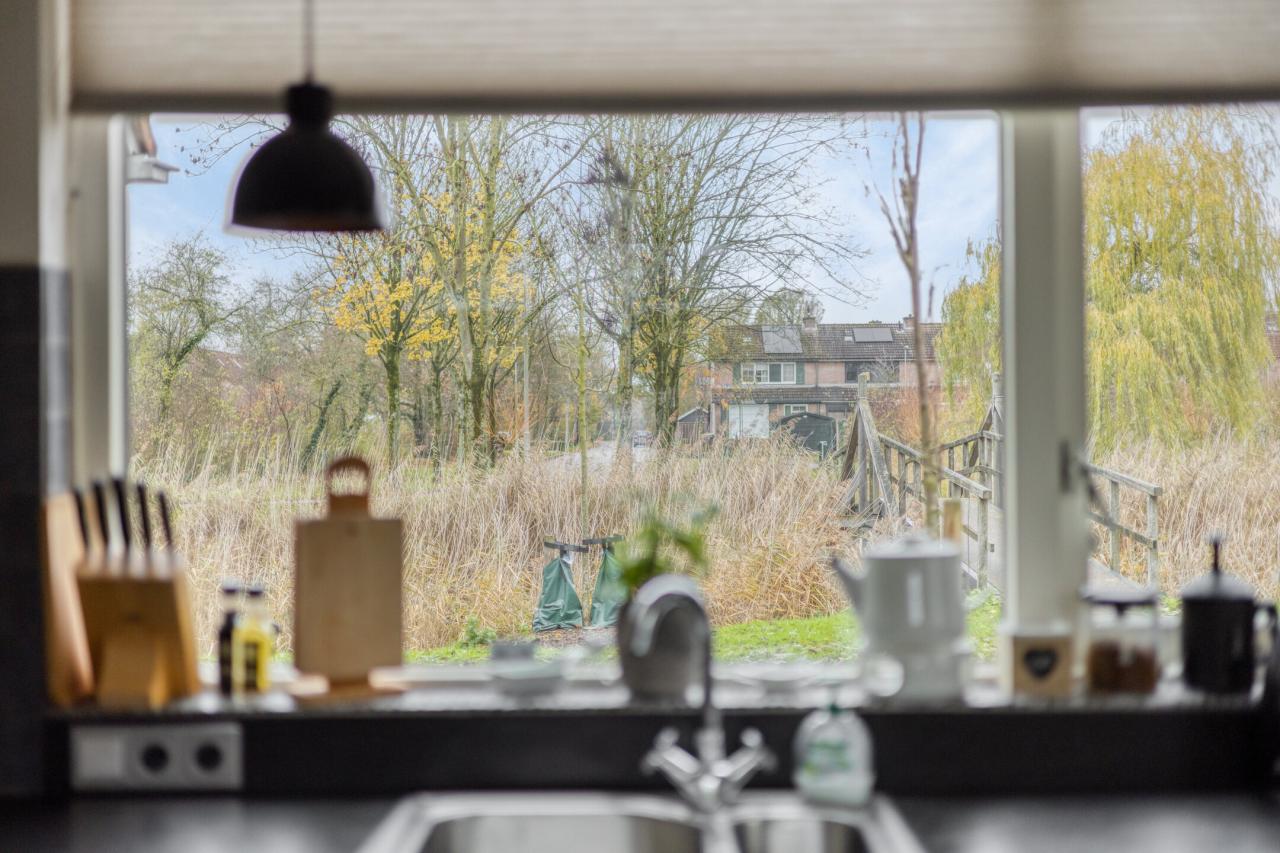 Entree met hal, meterkast en toilet met fonteintje. Lichte woonkamer met praktische trapkast, tuindeur en grote raampartijen met zicht op de tuin. Aan de voorzijde bevindt zich de open keuken, die uitzicht biedt op de parkachtige omgeving. De keuken is netjes en functioneel uitgevoerd en voorzien van een inductiekookplaat, afzuigkap, oven, koelkast, vaatwasser en een composiet werkblad.