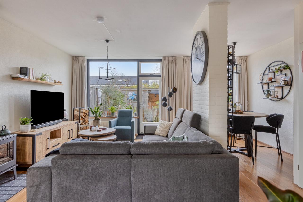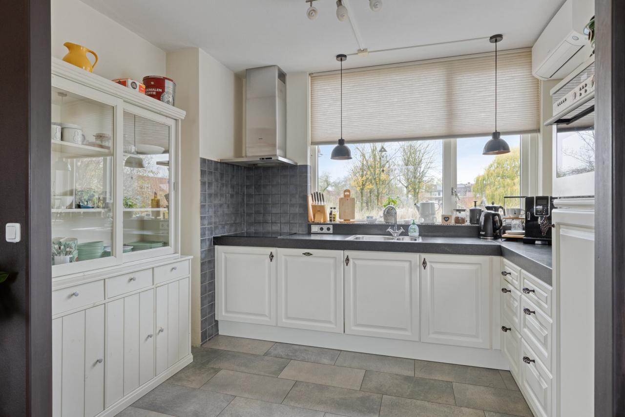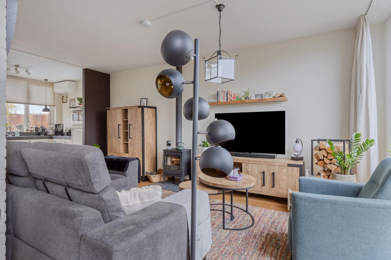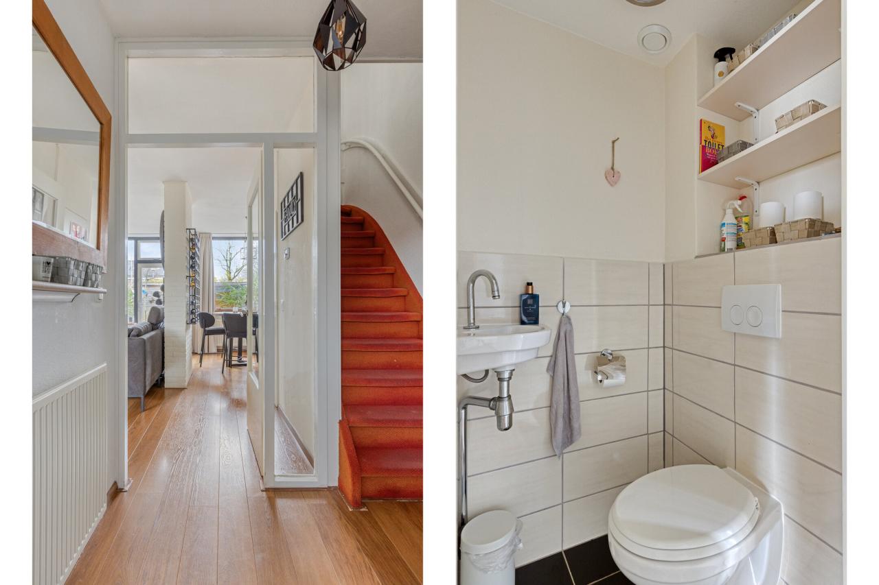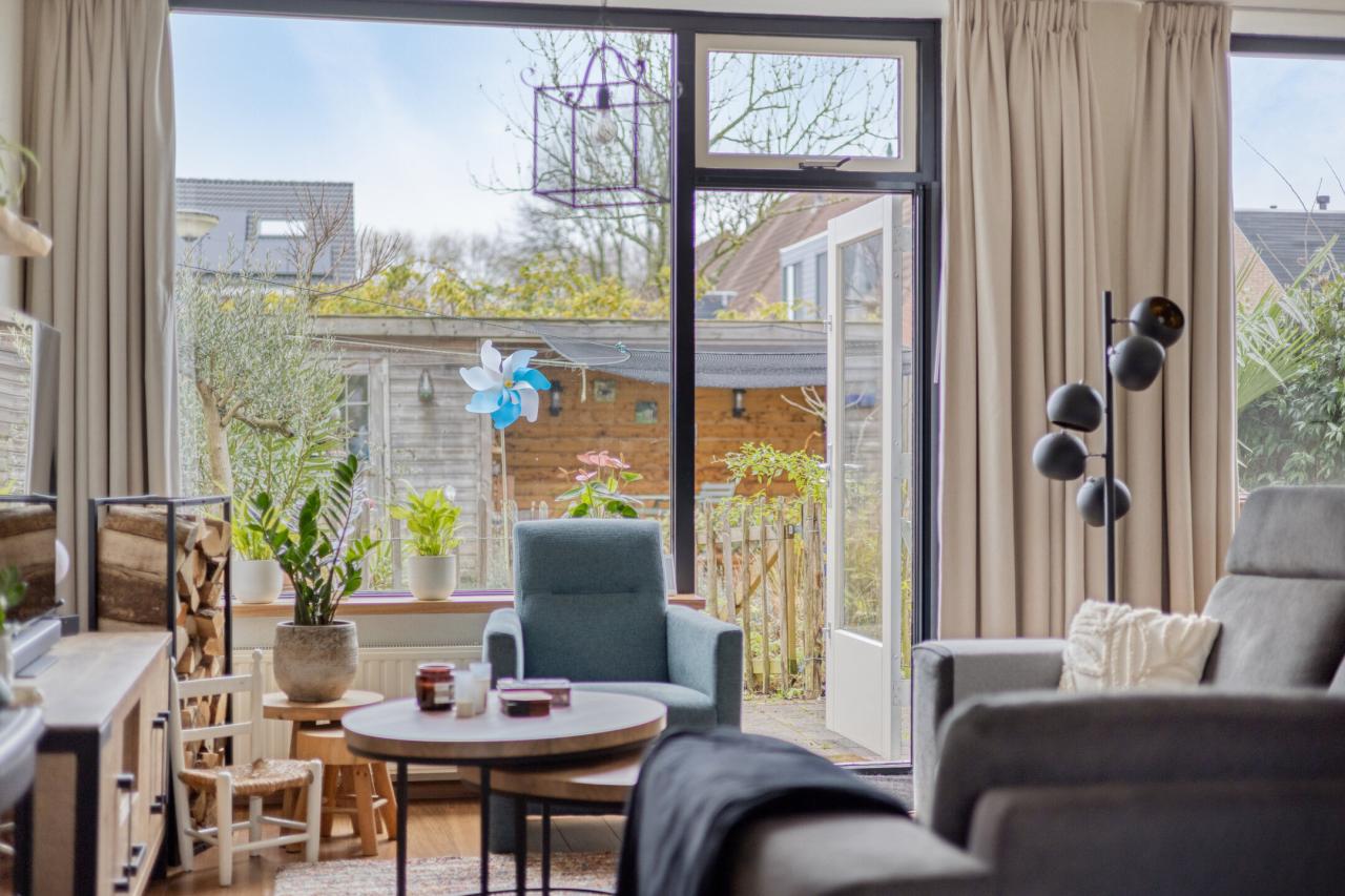 Entree met hal, meterkast en toilet met fonteintje. Lichte woonkamer met praktische trapkast, tuindeur en grote raampartijen met zicht op de tuin. Aan de voorzijde bevindt zich de open keuken, die uitzicht biedt op de parkachtige omgeving. De keuken is netjes en functioneel uitgevoerd en voorzien van een inductiekookplaat, afzuigkap, oven, koelkast, vaatwasser en een composiet werkblad.