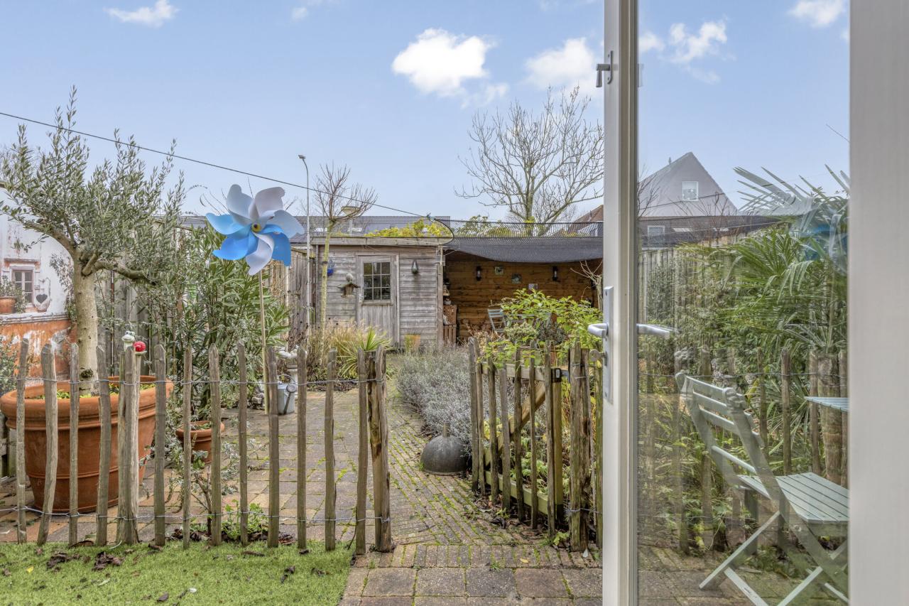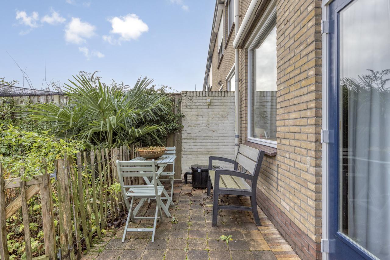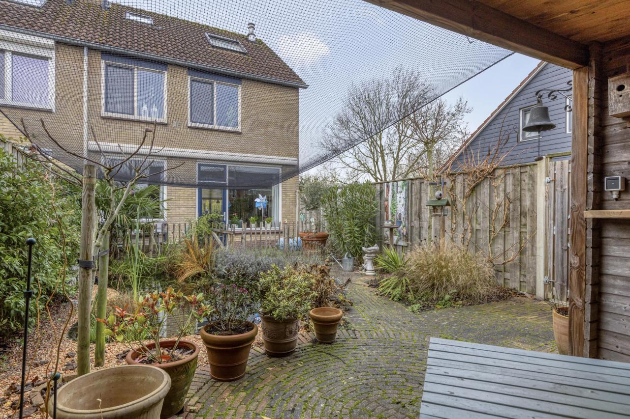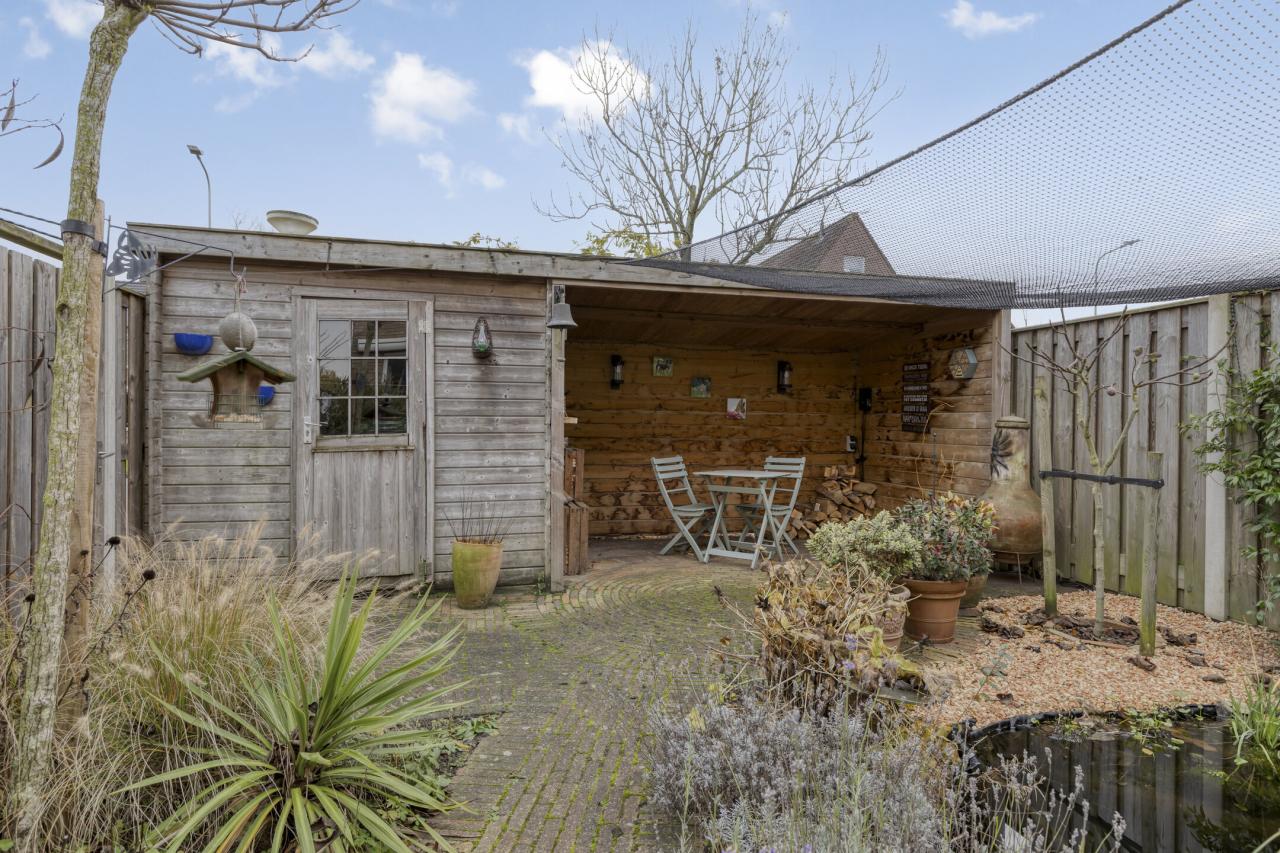 De achtertuin is verzorgd aangelegd en volledig omheind met een degelijke schutting met poort, wat zorgt voor optimale privacy. De tuin heeft een gunstige bezonning. Achter in de tuin staat een houten tuinhuis met overkapping. Direct achter het huis ligt een terras met een elektrisch zonnescherm.