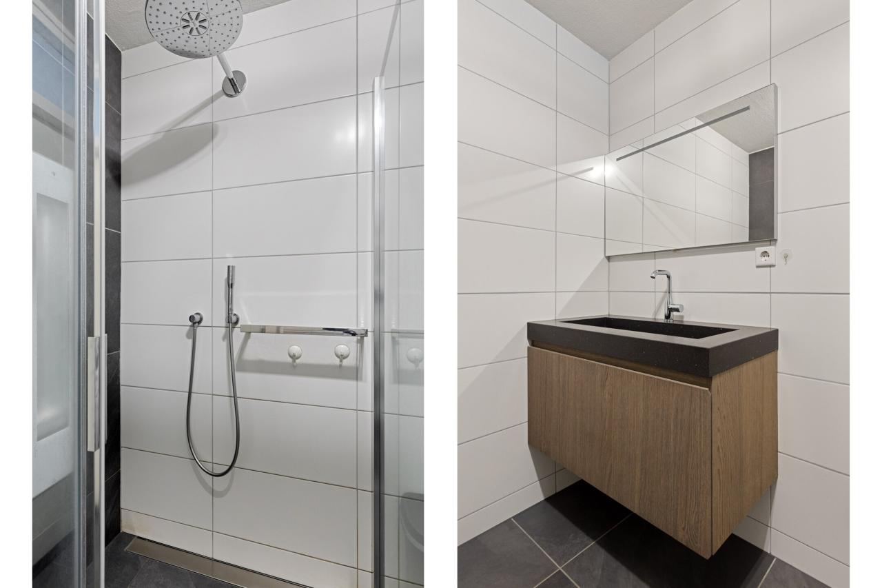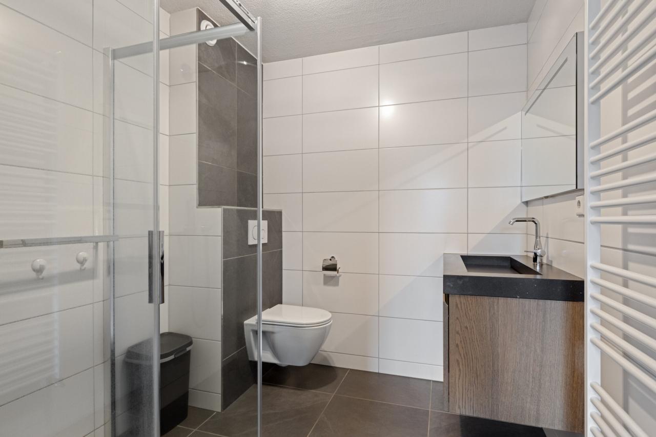 De badkamer is in 2021 gerenoveerd en voorzien van modern tegelwerk, een inloopdouche met Sunshower, een wastafelmeubel met spiegel en een toilet.