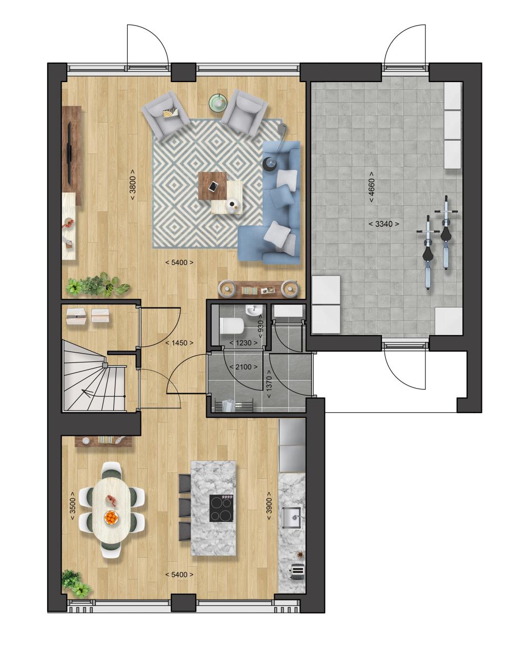 Ook deze woning kom je via de zijkant binnen en heeft een ruime woonkeuken aan de voorzijde. Een heerlijke plek om met het gezin te vertoeven en voldoende ruimte voor een ruime keukenopstelling. De woonkamer ligt aan de achterzijde en met de grote raampartijen kijk je op de achtertuin.