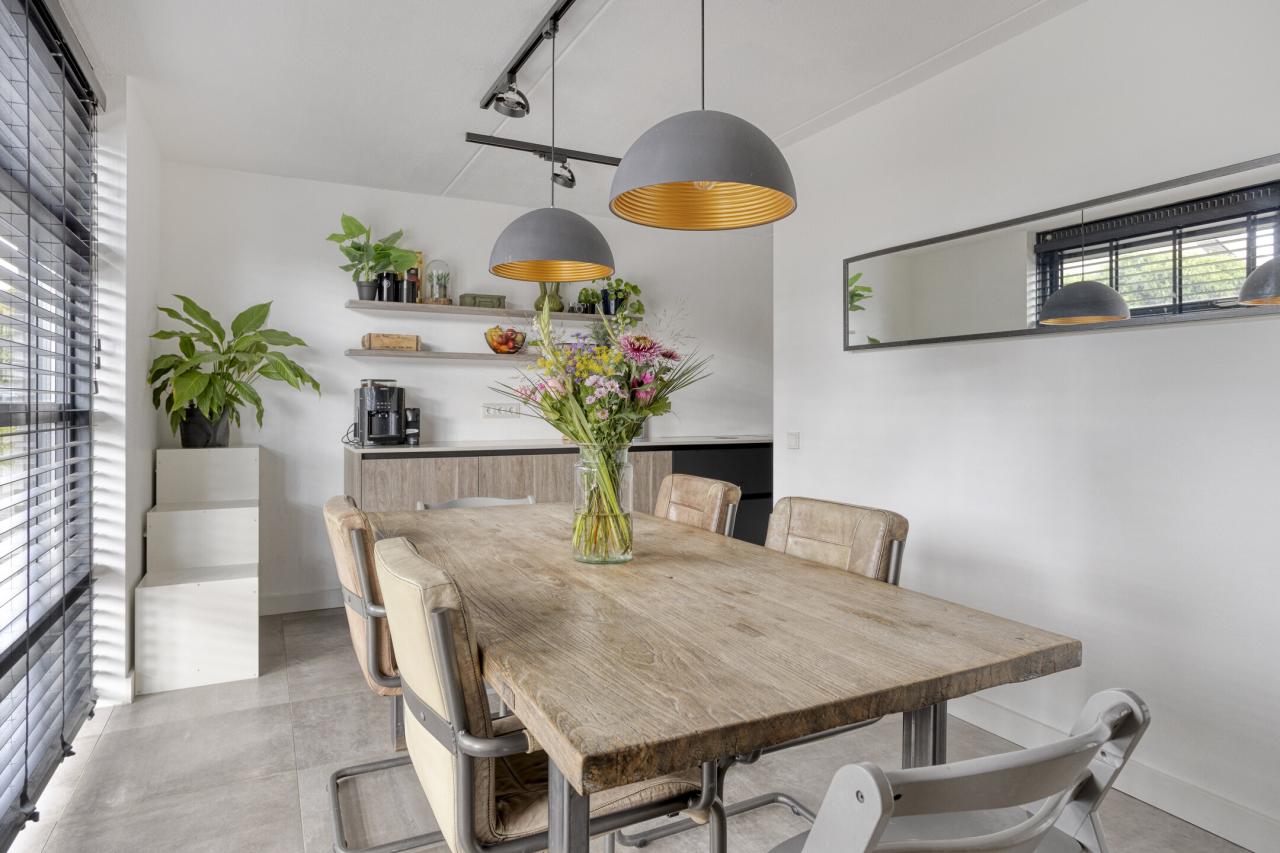 De ruime hal is een mooie binnenkomer. Hier vinden we de meterkast het toilet en de trap. De garage is vanuit de hal toegankelijk. Het huis heeft een speelse indeling. De keuken staat in het midden zodat er aan de achterkant een lichte tuingerichte living is met openslaande deuren naar de tuin. Aan de voorkant is een eetkamer waar voldoende ruimte is voor een grote eethoek. Je kunt hier met gemak een 8 persoons eettafel kwijt. Beide kamers zijn zowel vanuit de hal als vanuit de keuken toegankelijk.