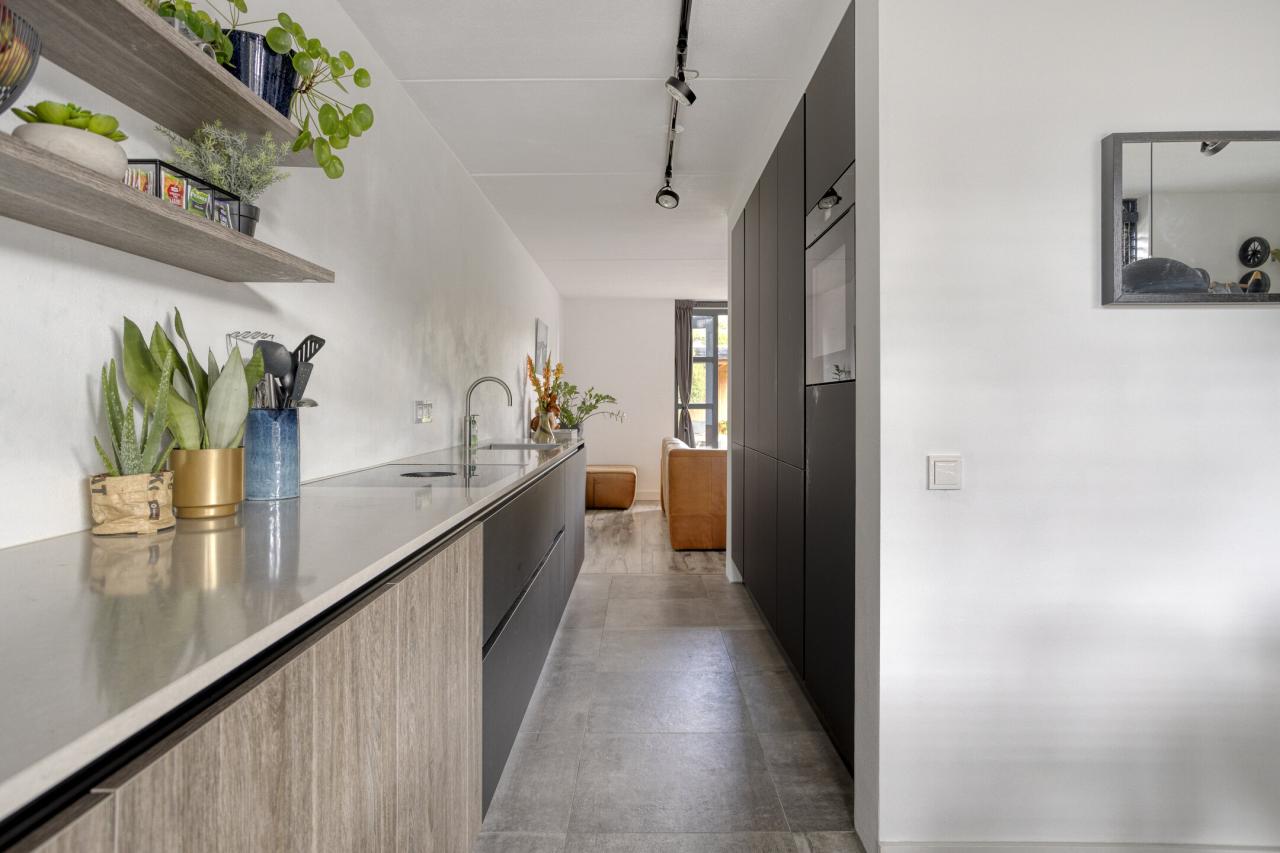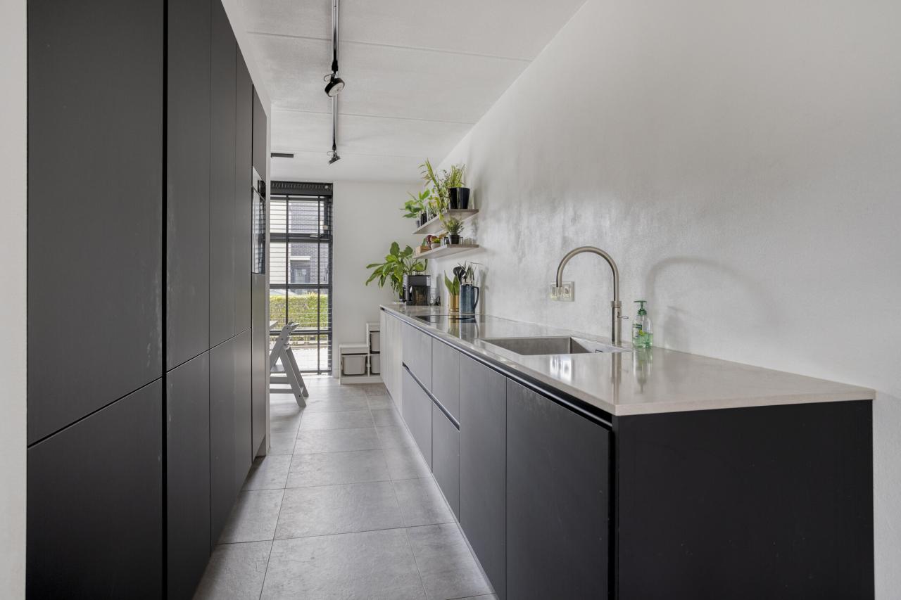 De keuken is in 2021 geplaatst en heeft een luxueuze uitstraling met aan de ene kant een grote kastenwand en aan de andere kant een lang aanrechtblad met daaronder kastruimte.