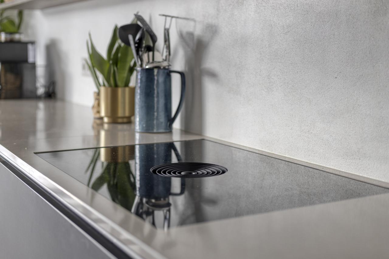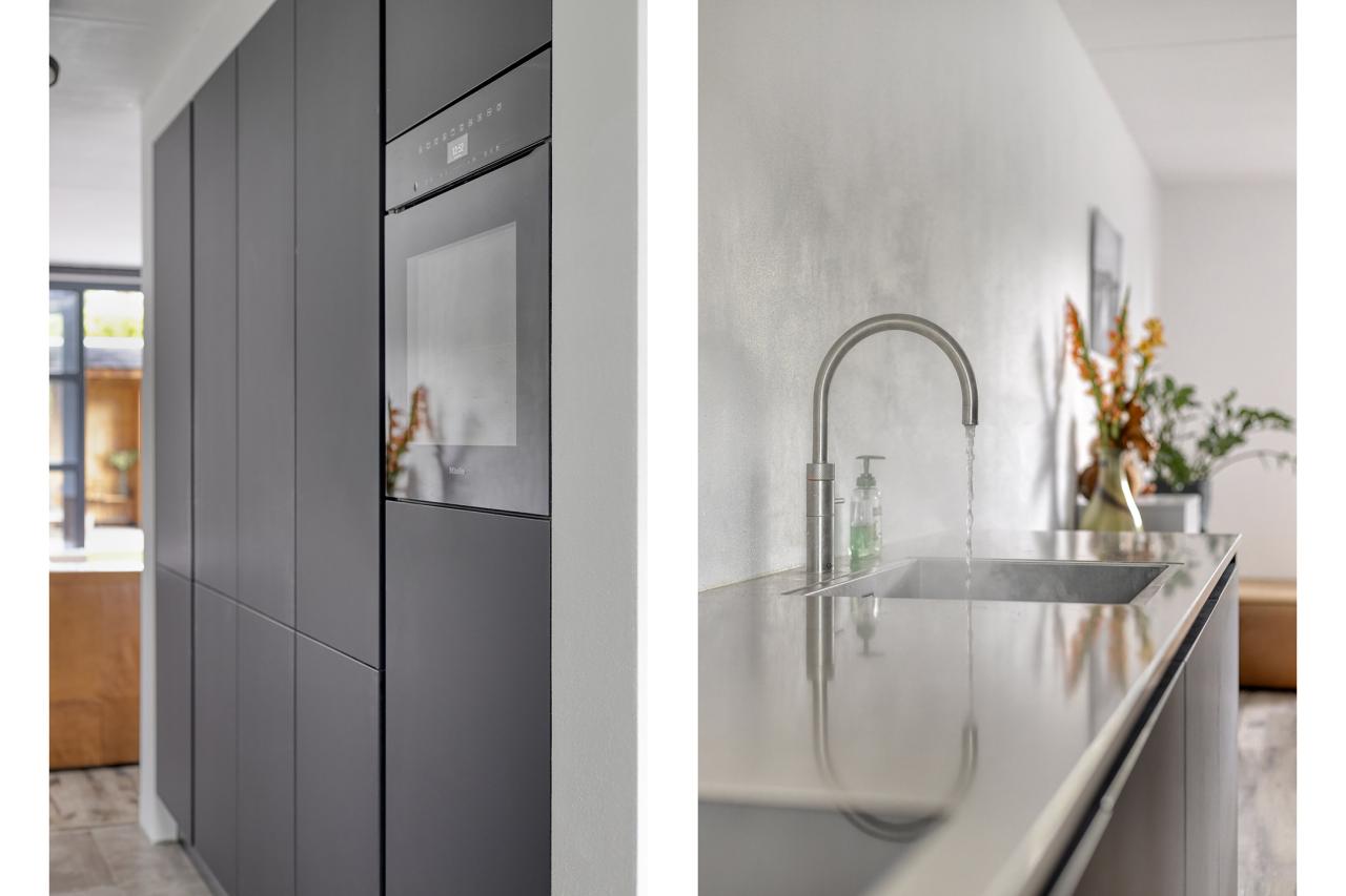 Je beschikt hier over: een inductiekookplaat met geïntegreerde afzuiging, oven, koelkast, vriezer, afwasmachine, kokend waterkraan en composiet werkblad