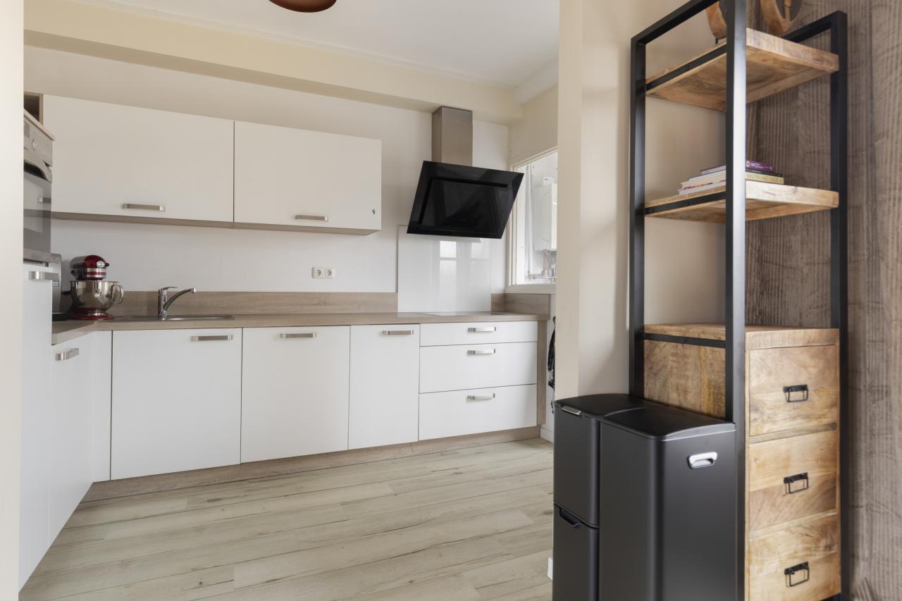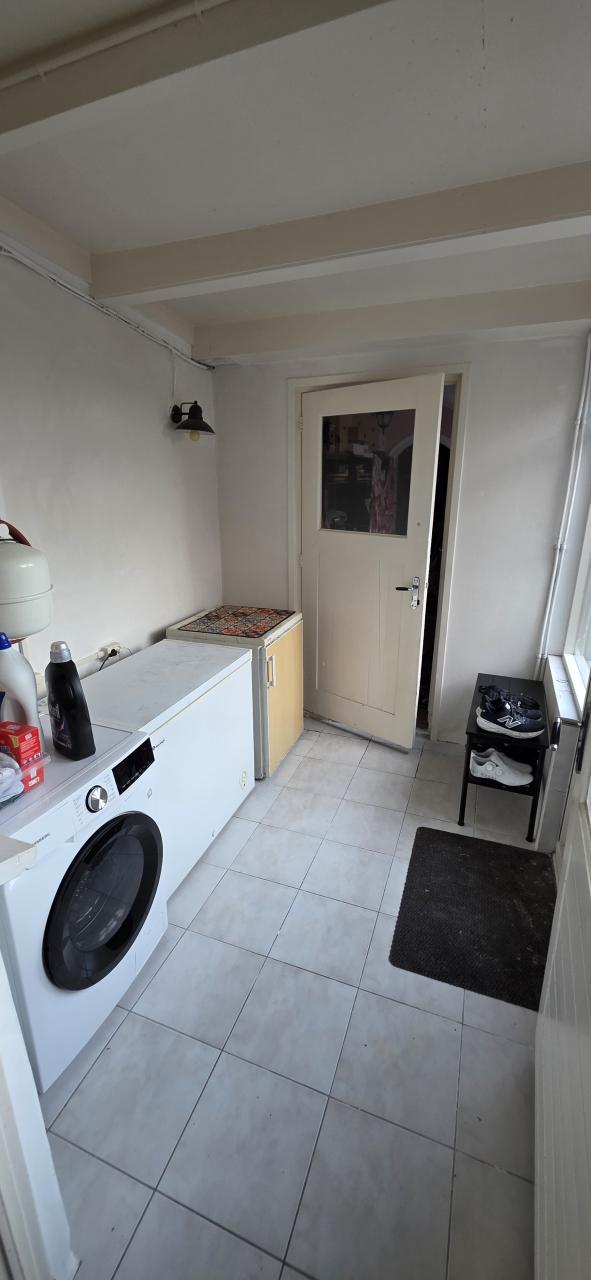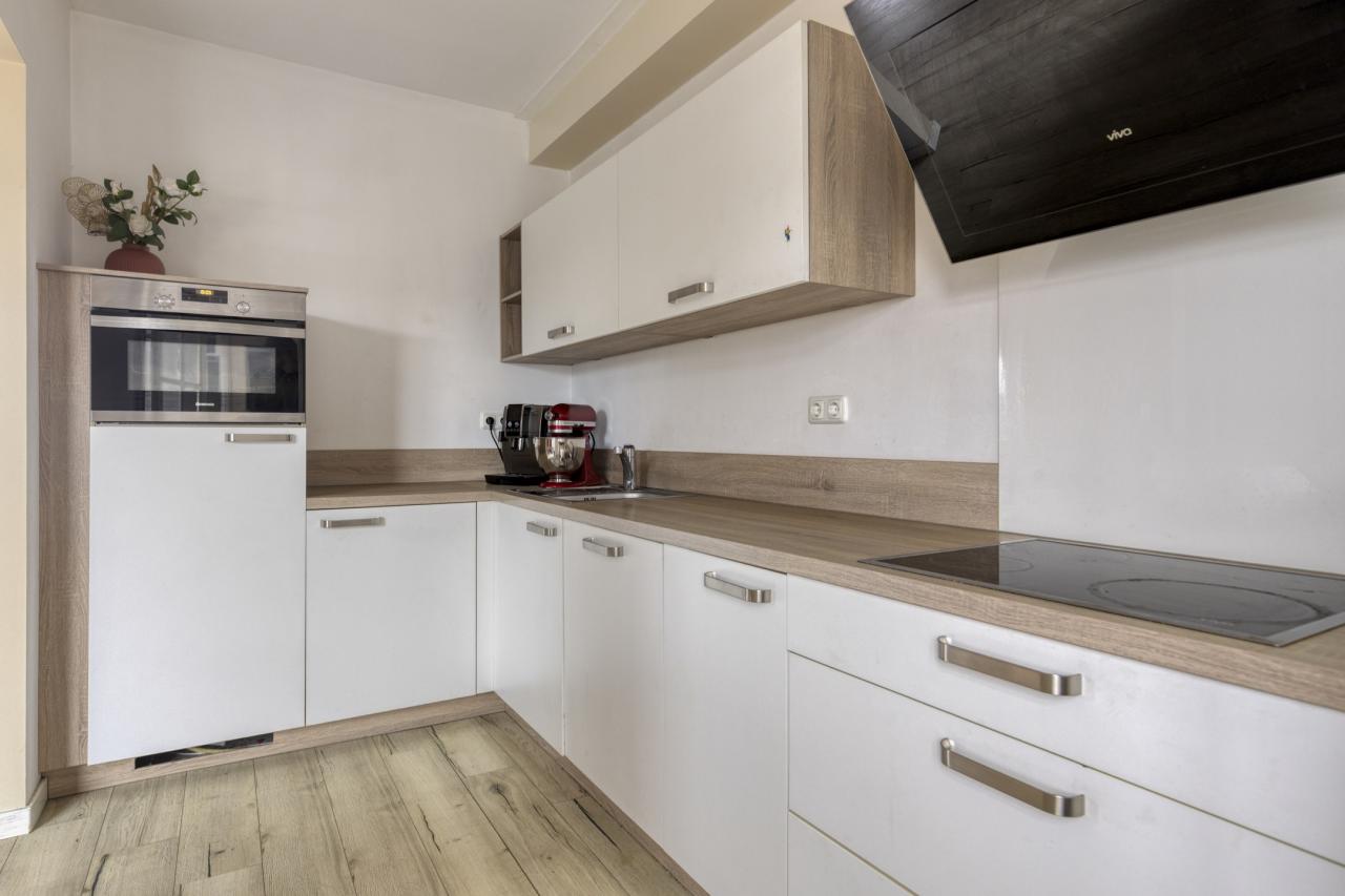 De woonkamer staat in open verbinding met de keuken, uitgevoerd in een praktische L-opstelling en voorzien van diverse inbouwapparatuur, waaronder een inductiekookplaat, afzuigkap, koelkast, oven en vaatwasser. Vanuit de keuken bereik je de bijkeuken, met de cv-opstelling, witgoedaansluitingen en een achterdeur.