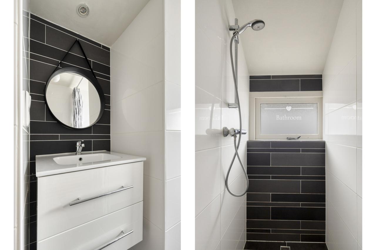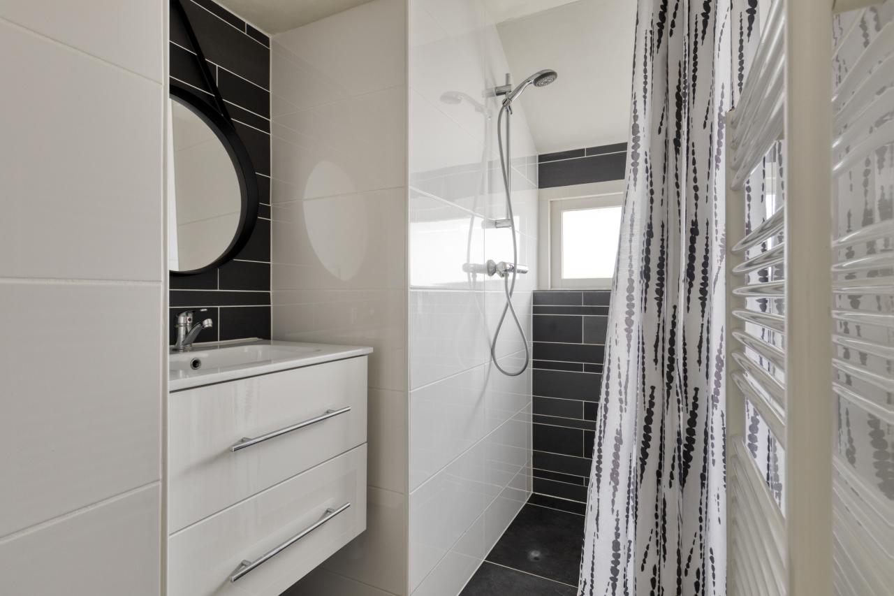 De badkamer is compact maar verzorgd uitgevoerd en voorzien van een douche en een wastafelmeubel.