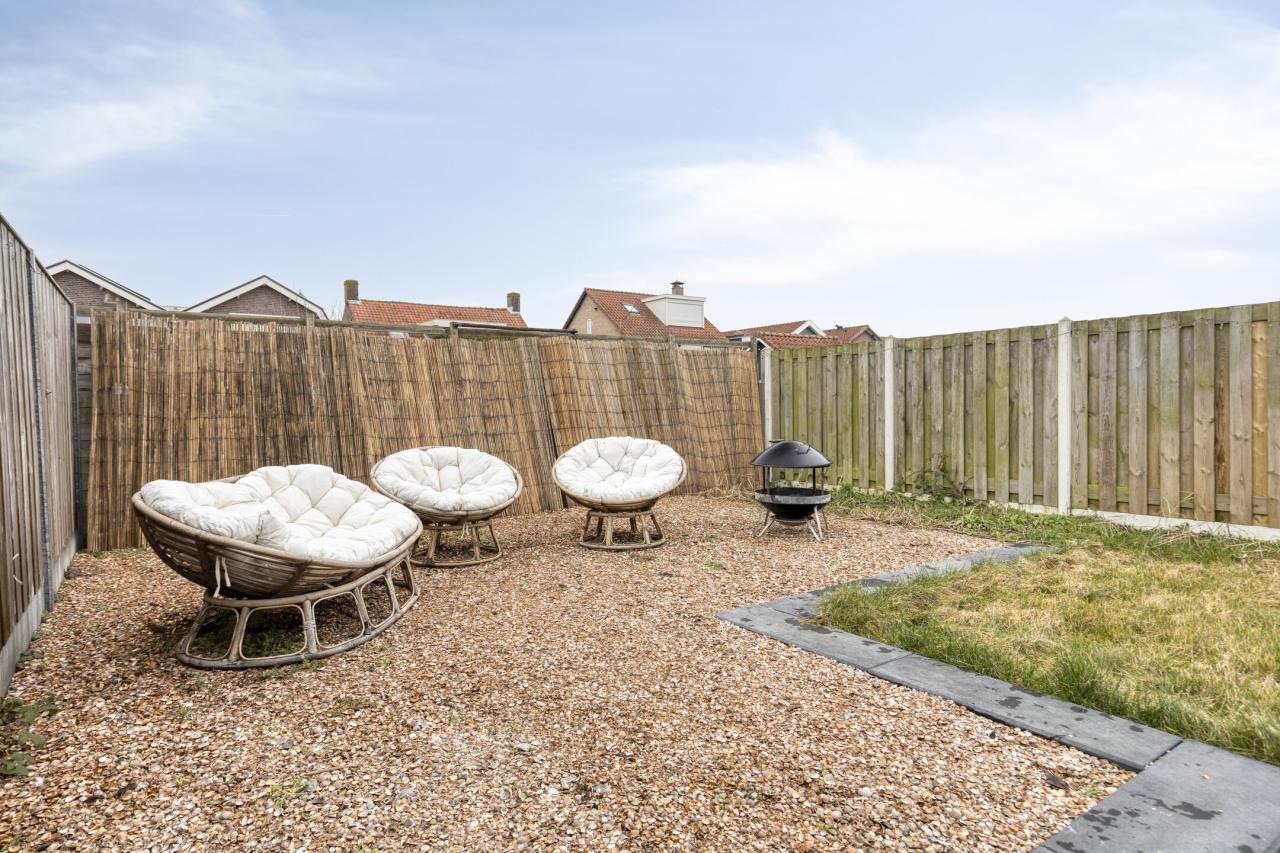 De ruime, op het oosten gelegen achtertuin beschikt over een vrije achterom. Dankzij de royale afmetingen is er altijd wel een zonnig plekje te vinden. Een fijne tuin waar je in alle rust kunt ontspannen of gezellig buiten kunt zitten.