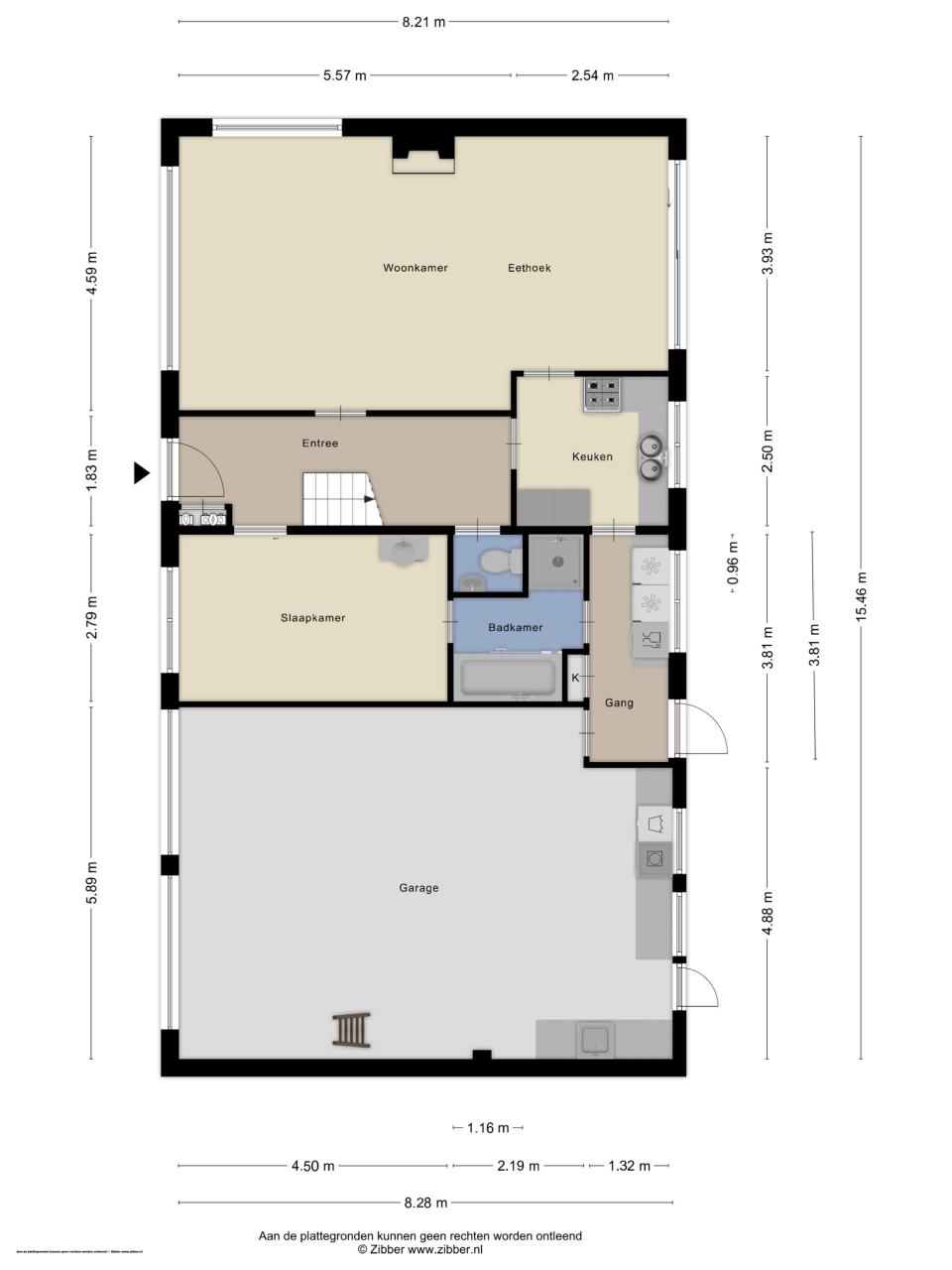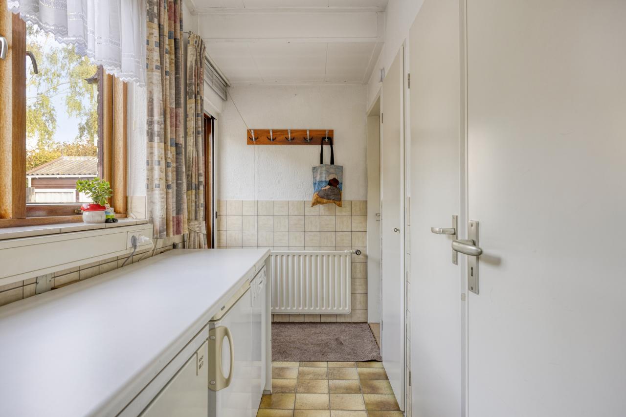 Ruime entree met meterkast en toilet. Aan de rechterzijde bevindt zich een slaapkamer (ca. 2,80 x 4,50 m) met een eigen badkamer en suite _ ook bereikbaar via de bijkeuken. Links van de hal ligt de lichte woonkamer met schuifpui naar het terras en aansluitend een praktische keuken. De bijkeuken biedt toegang tot de royale inpandige dubbele garage; ideaal voor opslag, werkruimte of het realiseren van extra woonruimte.