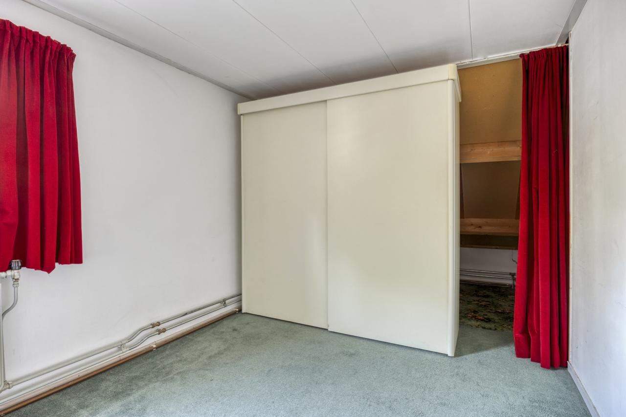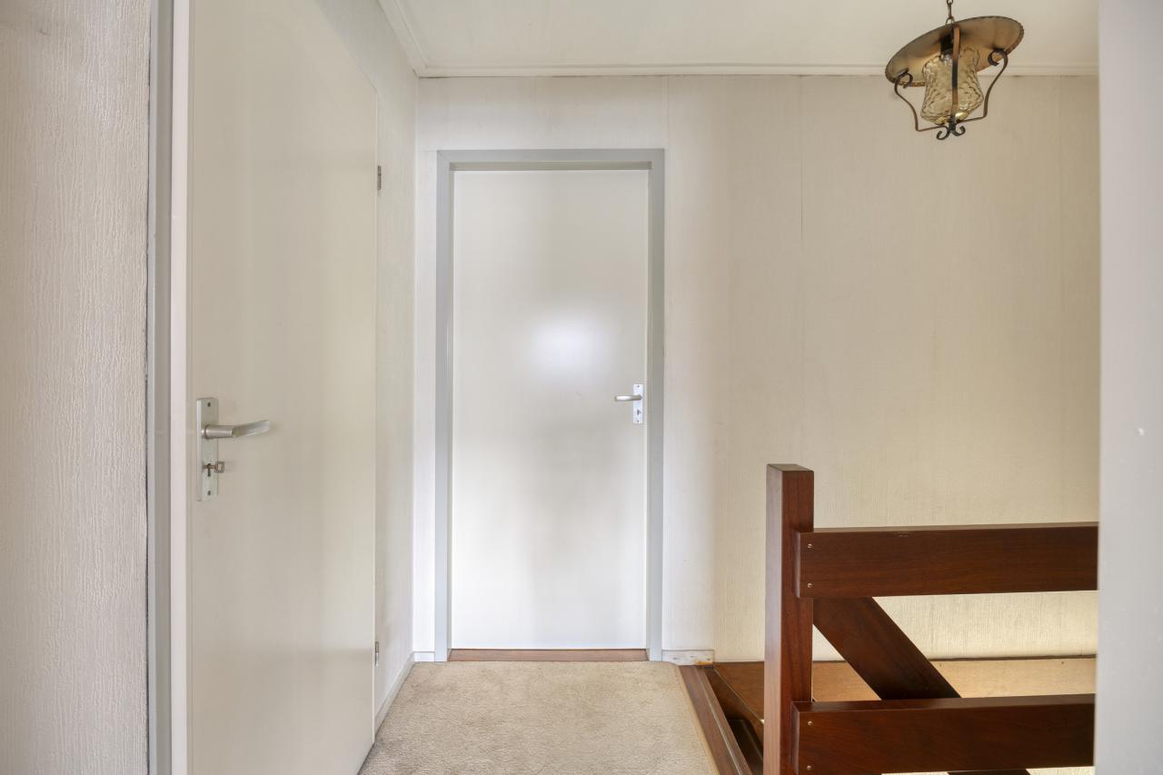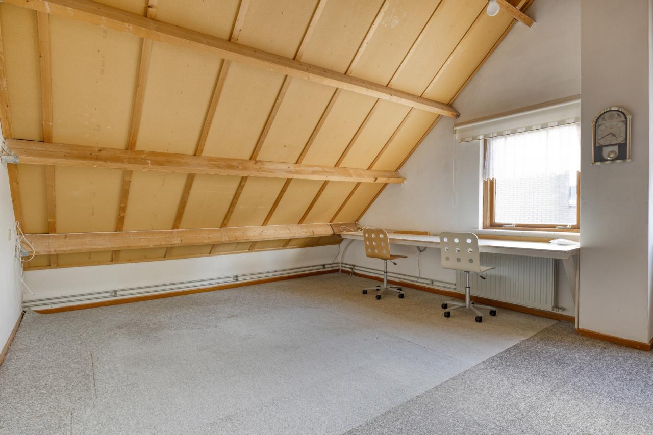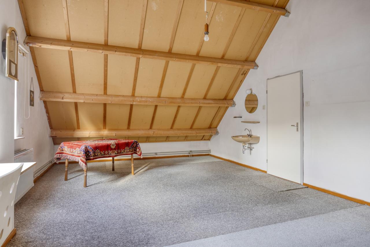 Via de vaste trap bereikt u de overloop met bergruimte en cv-opstelling. De grootste slaapkamer heeft een vloeroppervlak van maar liefst 27 m² (gemeten op 1,50 m-lijn) en kan eenvoudig worden gesplitst in twee kamers. De tweede slaapkamer (ca. 15 m²) is eveneens ruim en voorzien van een vaste kast.