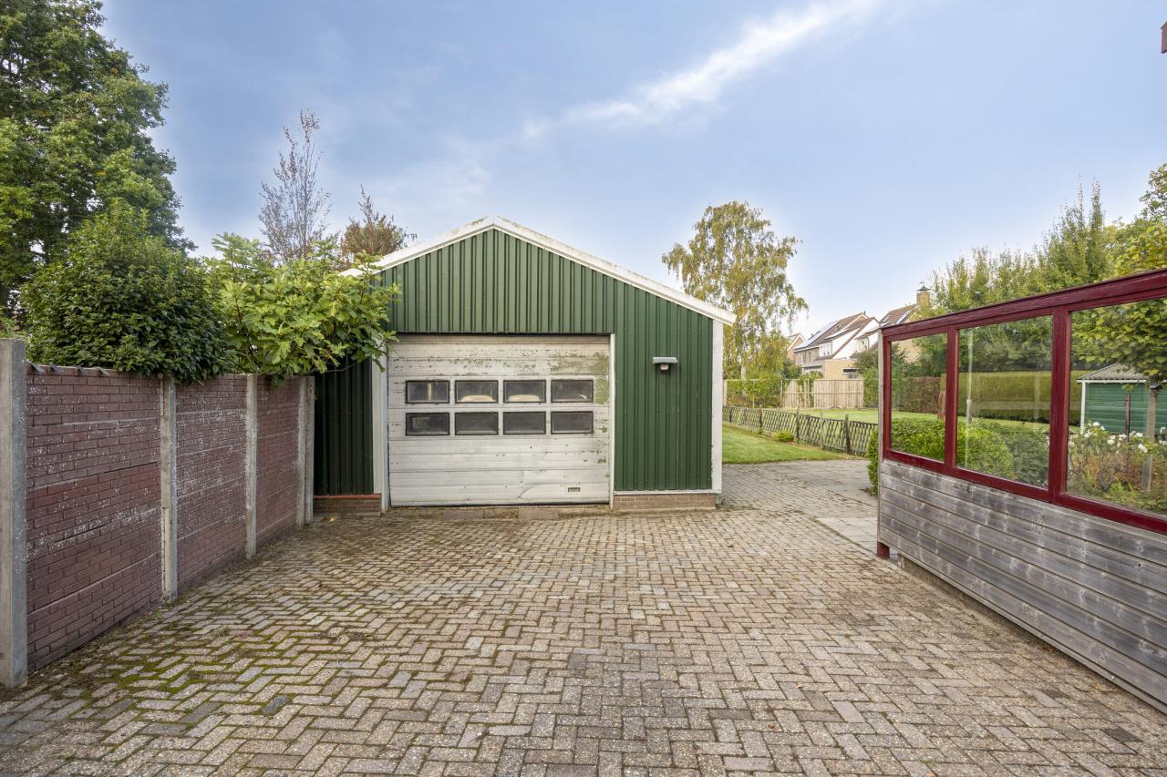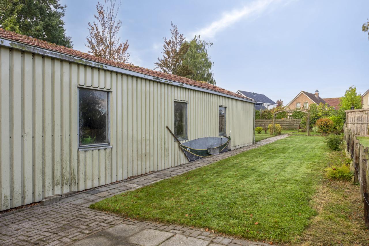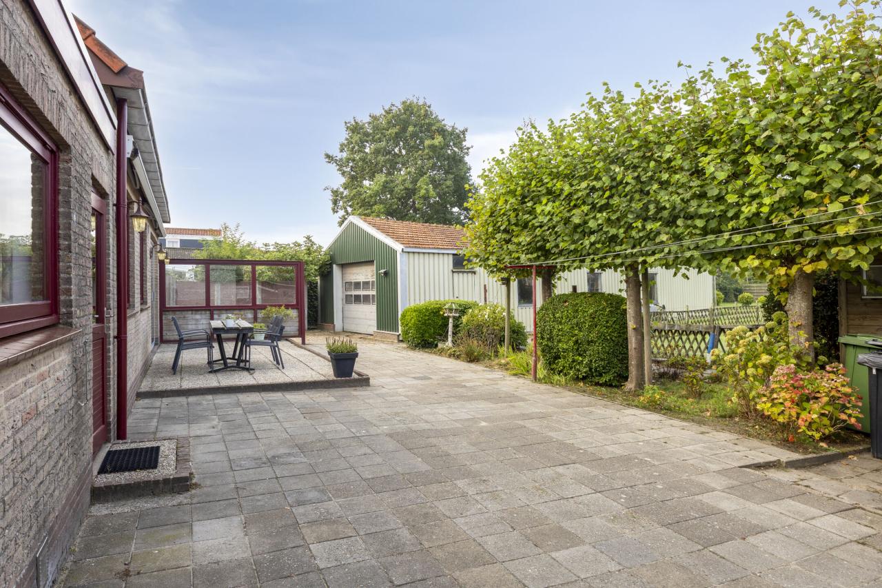 Rondom de woning ligt een heerlijk ruime tuin met de hele dag zon. De brede oprit biedt plaats aan meerdere auto's en ook bij de loods is voldoende parkeerruimte aanwezig. Direct achter de woning ligt een groot terras, perfect voor lange zomeravonden. Achter de loods strekt de tuin zich nog circa 50 meter uit _ een fantastisch stuk grond met volop privacy, ideaal voor liefhebbers van groen en buitenleven.