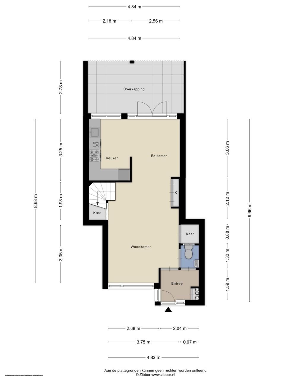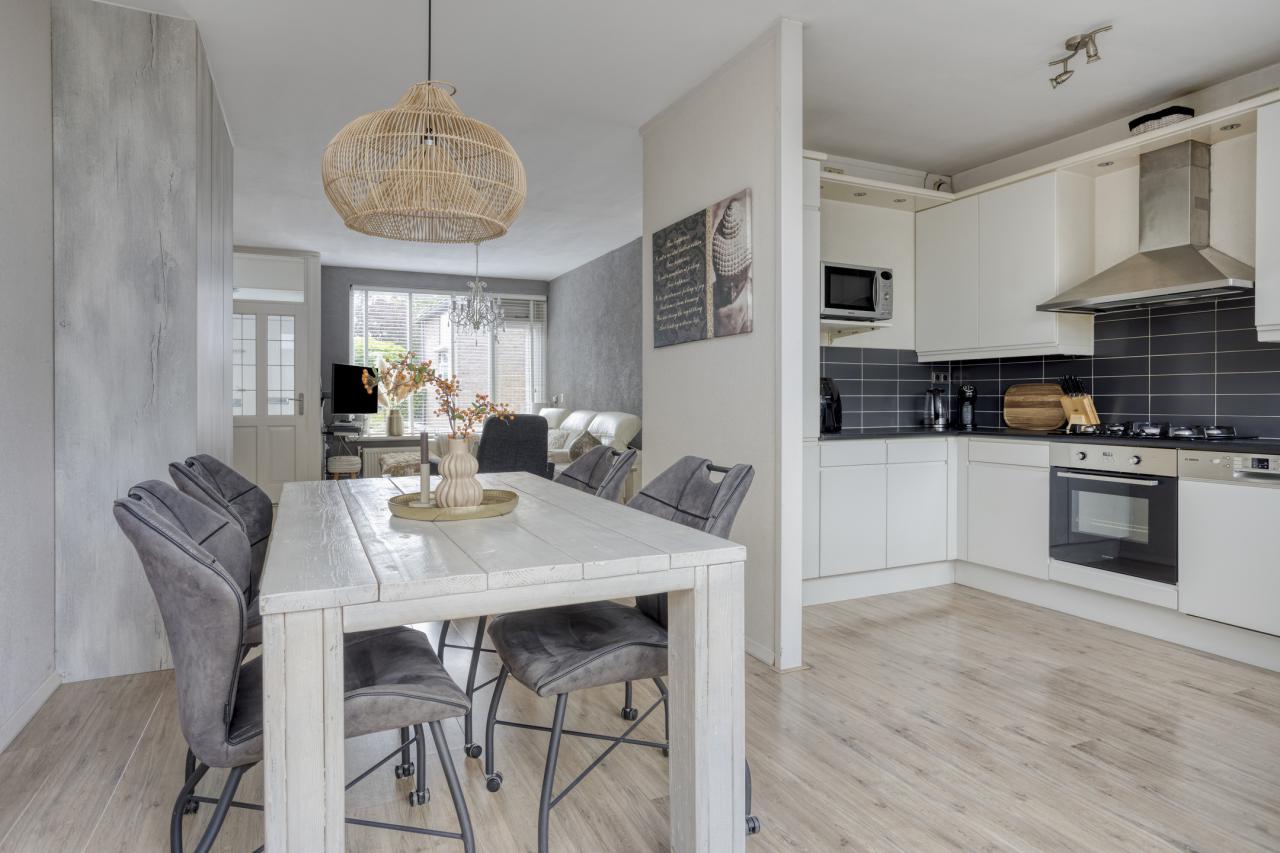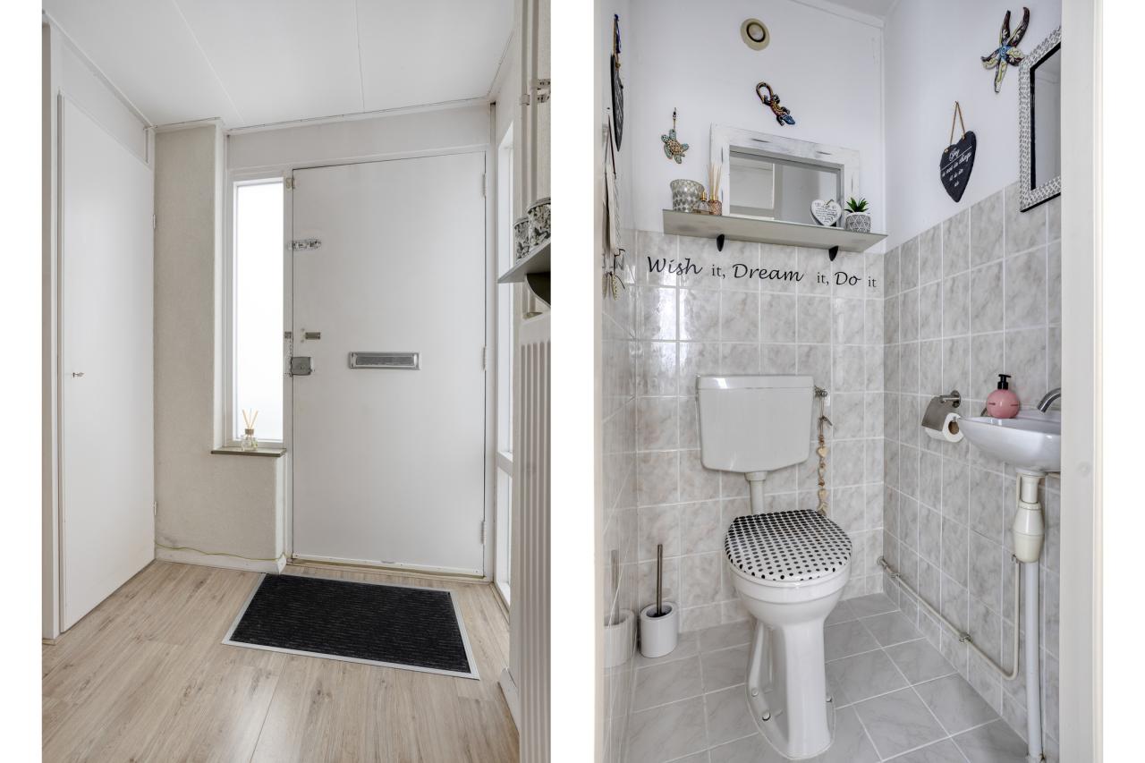 Entree met hal, meterkast en toilet met fonteintje. De ruime, lichte woonkamer beschikt over een vaste kast. Aan de voorzijde is plek voor een royale zithoek, terwijl je aan de tuinzijde een ruime eethoek kunt plaatsen. De openslaande tuindeuren zorgen voor optimaal contact met het overdekte terras.