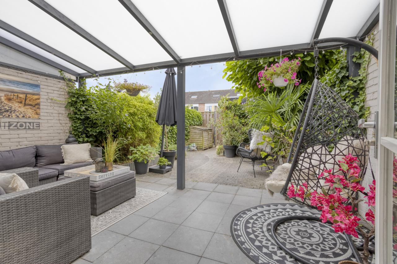 De sfeervolle achtertuin ligt op het westen, heeft veel privacy en een vrije achterom.